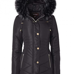 Women Longer Length Plush Lined Quilted Winter Puffer Coat Zip-Off Fur Trim Hood